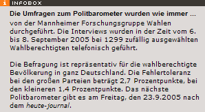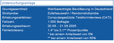 15.09.2005 | 42 | 35 | 7 | 6 | 8 | Forsa | 2504 (keine Angabe) |