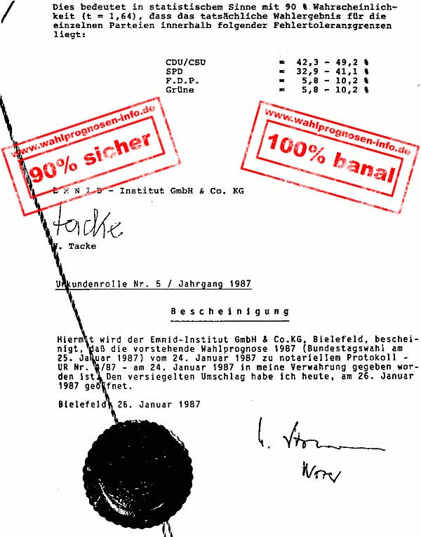 Emnid (Datenzulieferer n-tv und Focus) nimmt es mit der Genauigkeit von Umfragen tierisch ernst. Wie eine Prognose mit 90% Wahrscheinlichkeit aussieht, hat sich Emnid notariell beglaubigen lassen - einen Tag vor der Bundestagswahl: