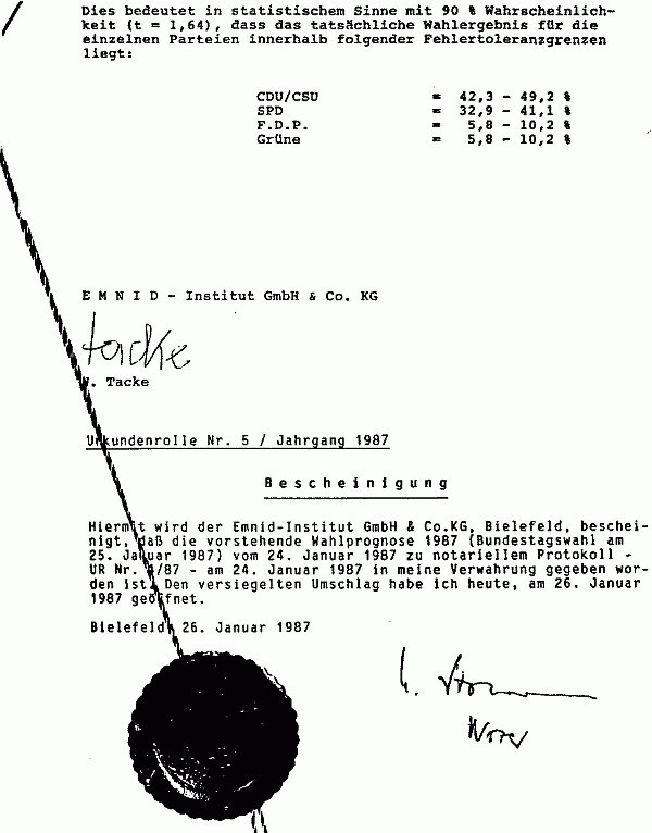 Emnid (Datenzulieferer n-tv und Focus) nimmt es mit der Genauigkeit von Umfragen tierisch ernst. Wie eine Prognose mit 90% Wahrscheinlichkeit aussieht, hat sich Emnid notariell beglaubigen lassen - einen Tag vor der Bundestagswahl:
