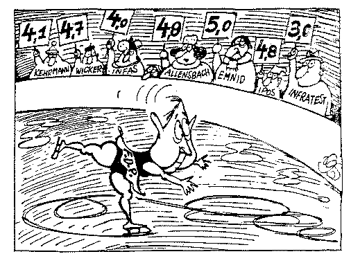 Man beachte, daß die 10 Institute weder gepfuscht noch geschummelt haben. Im Gegenteil, ihre Resultate - nämlich die 10 obigen Auslosungen - sind unter idealen Bedingungen zustande gekommen, es wurden alle Kunstregeln der Demoskopie und Statistik eingehalten. Die Unterschiede beruhen also nicht auf schlechter Arbeit oder gar Günstlingswirtschaft. Vielmehr lassen sie sich grundsätzlich nicht vermeiden, sie sind durch die Methoden der Demoskopie bedingt, nämlich durch die Auslosung des repräsentativen Querschnittes. Die folgende Karikatur (Spiegel Nr.8/1983) im Vorfeld der Bundestagswahl 1983, bei welcher es um das Überleben der FDP ging, macht klar, wie sehr der Leistungsanspruch an die Demoskopie und ihre tatsächlichen Möglichkeiten auseinanderklaffen.