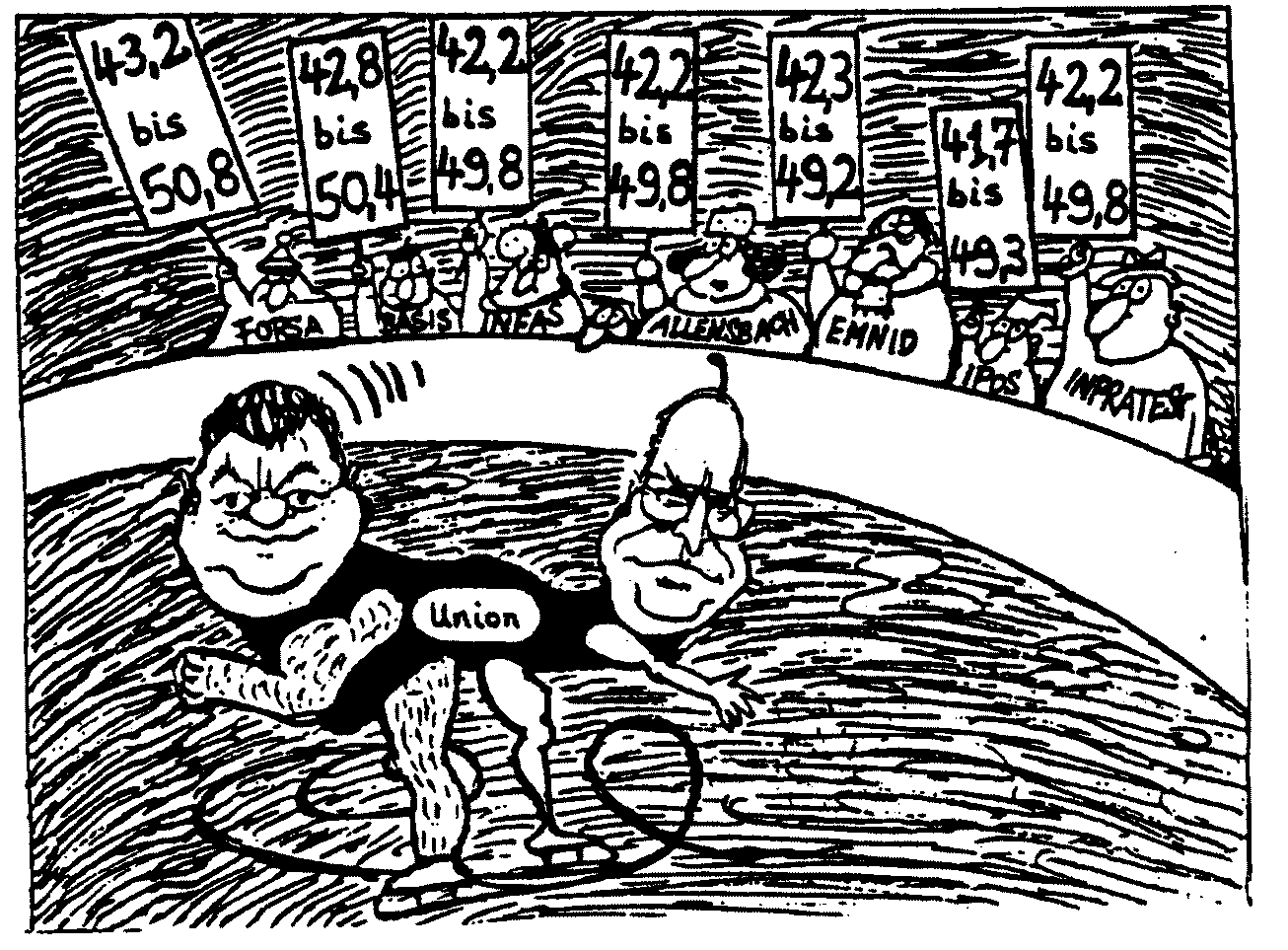 For in Germany, unlike other countries, the strengths of the dominating parties have traditionally varied in narrow ranges of a few percentage points. For instance, since 1965 the CDU/CSU has varied between 44,3% and 48,8%, the SPD between 37,0% and 45,8% and the swing party FDP between 5,8% and 10,6%. If, as of 1983, one adds the Greens to the SPD (one may consider the former to a large extent as a "spin off" from the latter), then the range of SPD narrows to 6,5% (from 39,3% to 45,8%). By comparison the customary confidence intervals amount to ñ2% to ñ4%. (Recall that their job is to keep you posted on the extent to which the information you get from your sample is distorted by lottery effects.) From this it is obvious that confidence intervals have the same order of magnitude as the historical variations of party strengths and sometimes they are even bigger. This means that "representative" samples provide no more information than the previous elections and often even less.