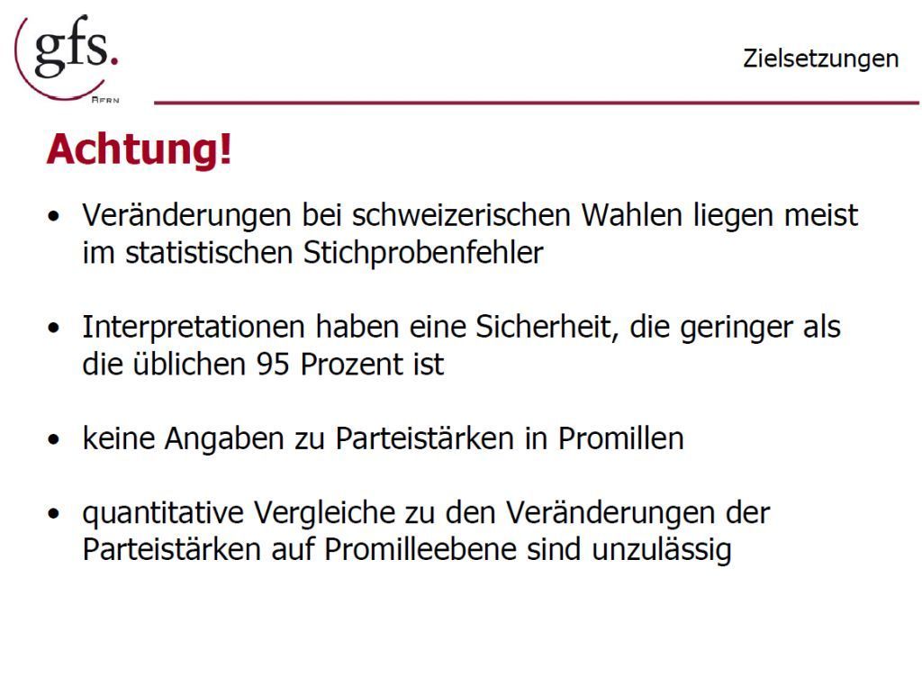 ein. Jede geringere Abweichung ist dabei wahrscheinlicher." SVP 27,3%, SP 21,7%, FDP 15,5%, CVP 15,4%, Grüne 10,0% hätten die grösste Wahrscheinlichkeit, richtig zu sein. Zahlen, die davon abweichen, wie z B. SVP 27, 5%, SP 22,1%, FDP 15,2%, CVP 15,6%, Grüne 10,4% hätten eine geringere Wahrscheinlichkeit, richtig zu sein. Je grösser